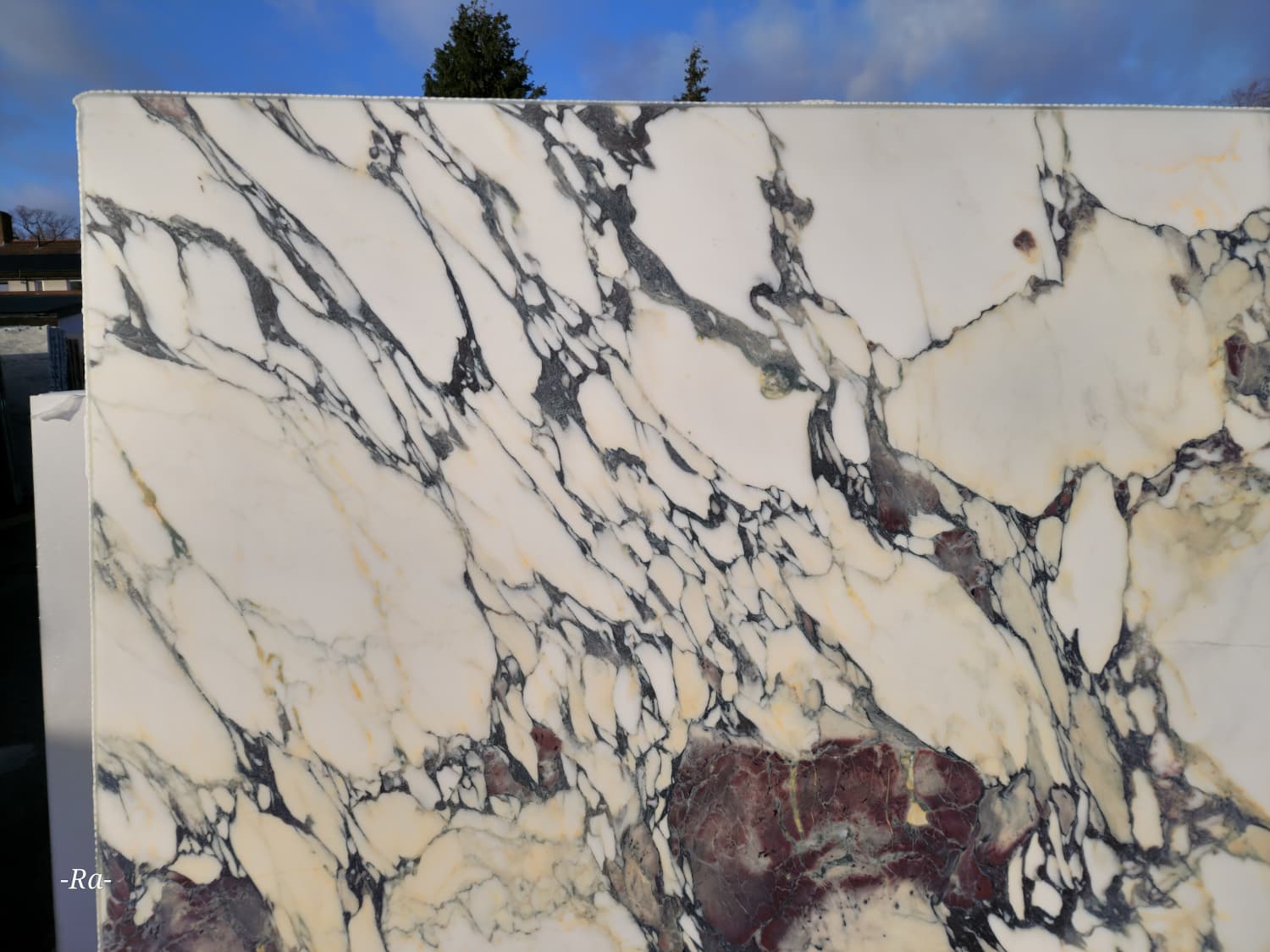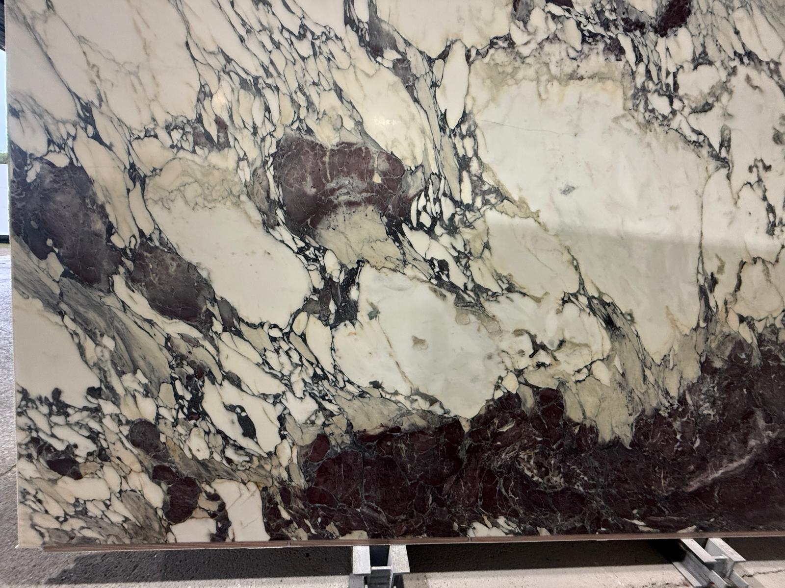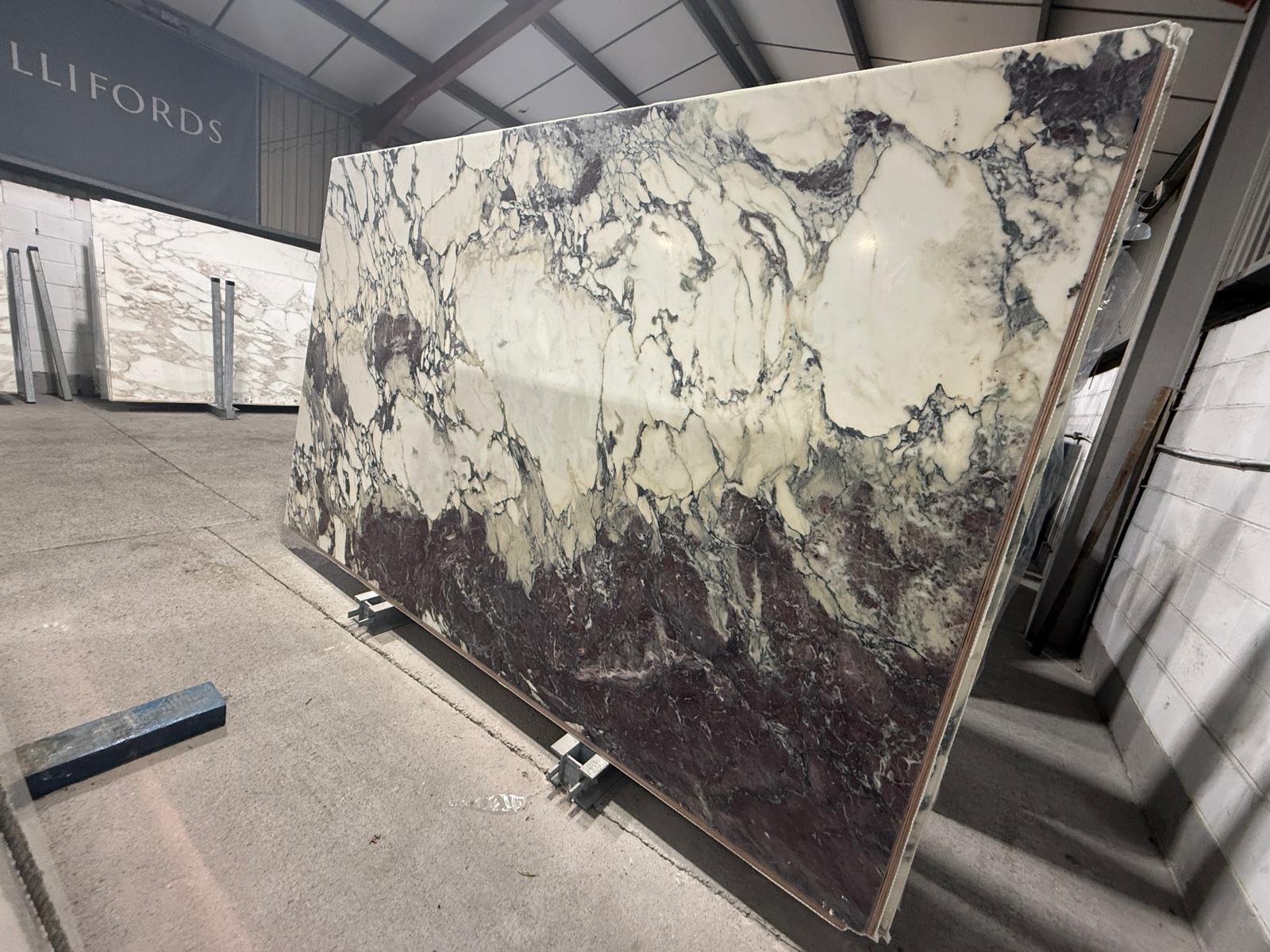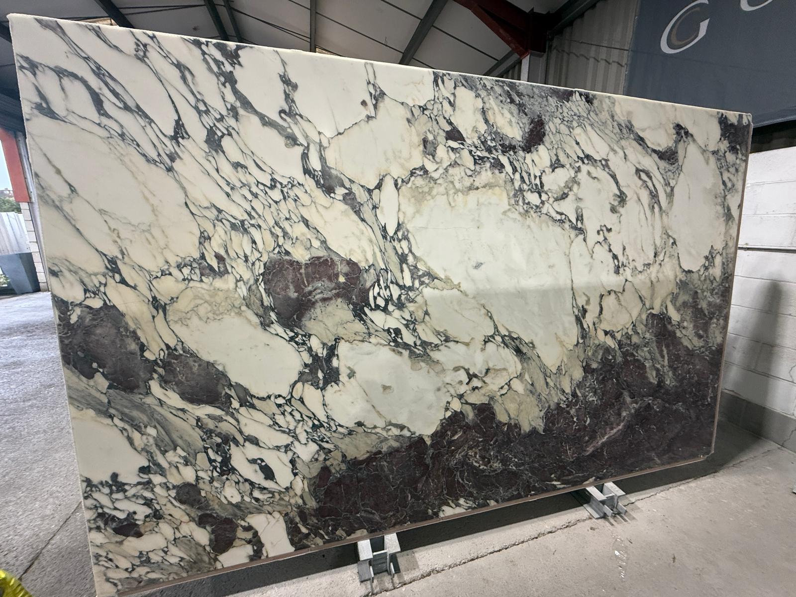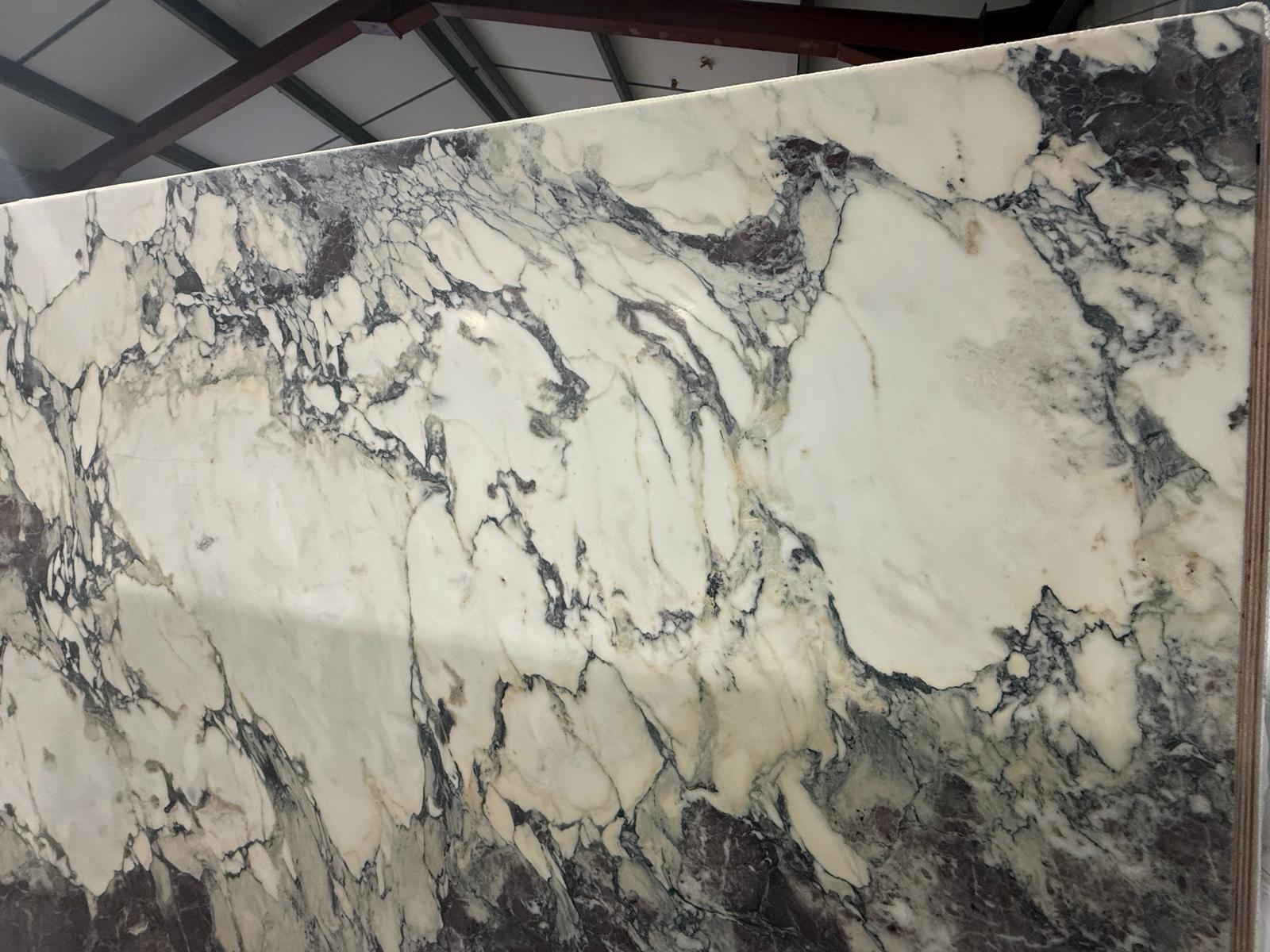 The palette blends pure white, soft lilac, deep plum, charcoal grey, and occasional warm gold accents, arranged in angular fragments, sweeping ribbons, and expressive mineral intersections depending on the block. Some selections lean more linear and elegant, while others display wild, high‑contrast brecciation. This natural drama gives Breccia Capraia a commanding presence suited to luxury residential, boutique hospitality, and architectural showpieces.