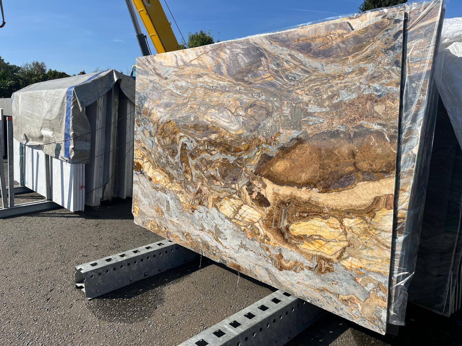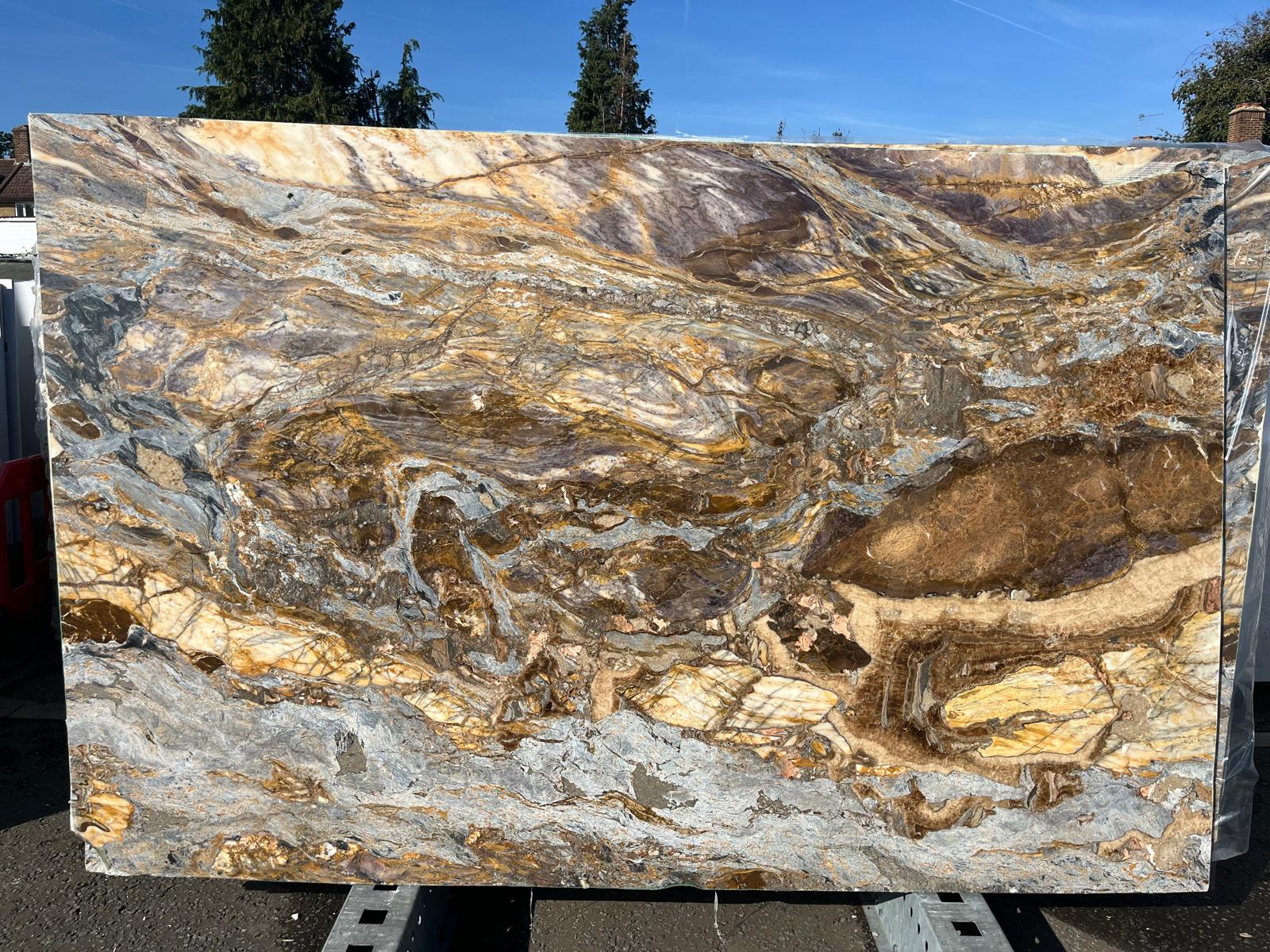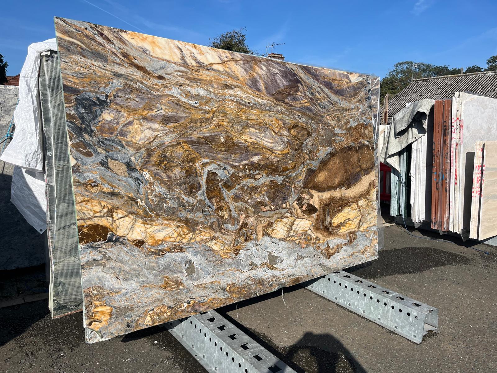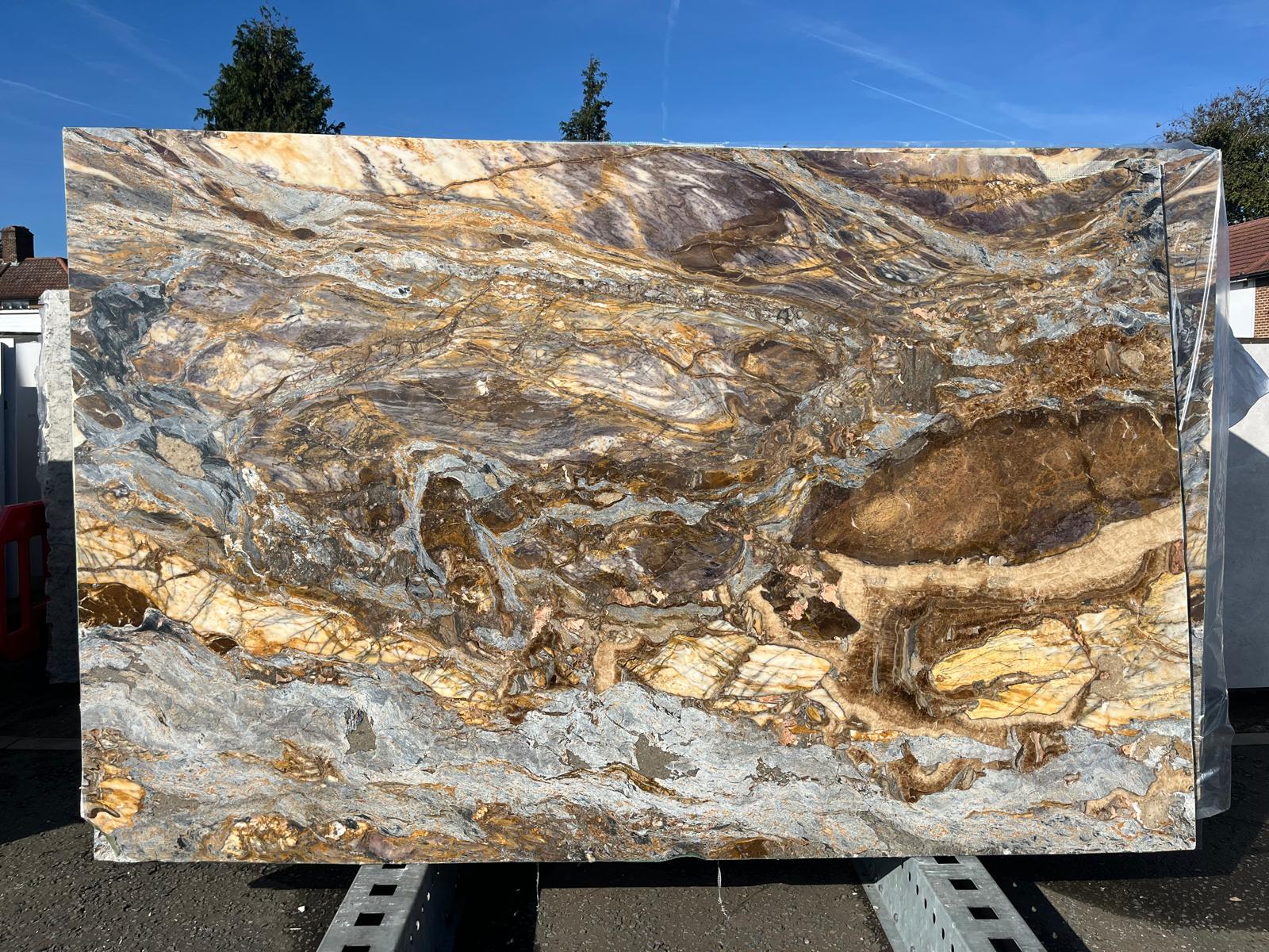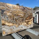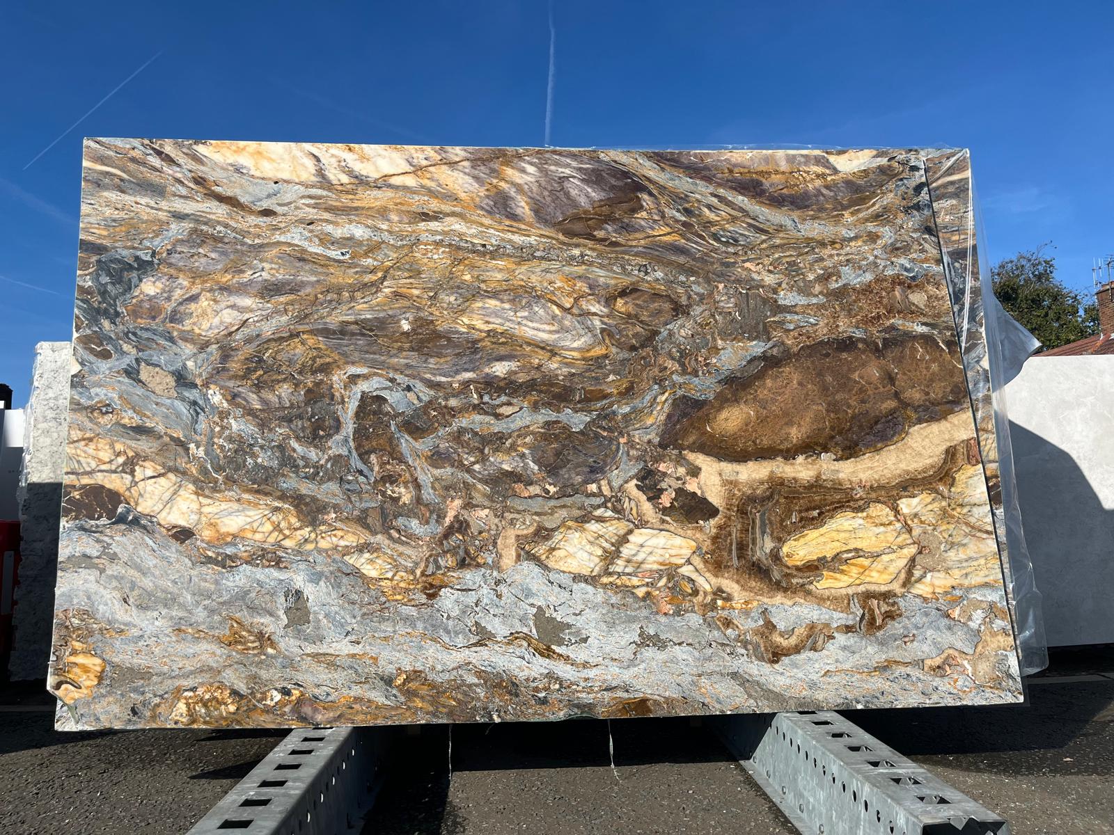 Calacatta Baroque is a masterclass in elegance. An opulent marble veined with dramatic sweeps of gold, ash grey, and soft taupe. Each slab tells a story of geological artistry, echoing the grandeur of classical architecture with a modern sensibility. It glows with warmth, while the bold veining adds movement and depth, making it ideal for statement surfaces in kitchens, bathrooms, and feature walls.