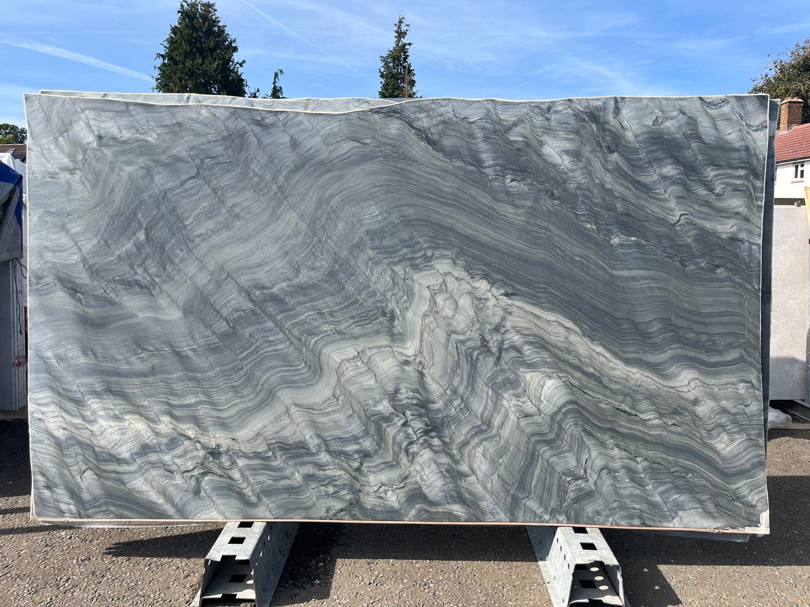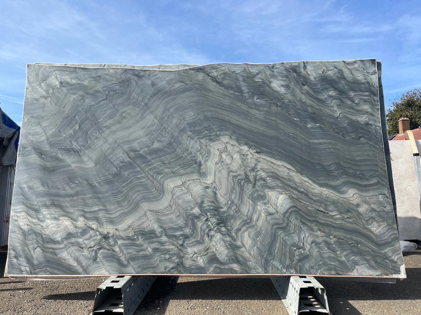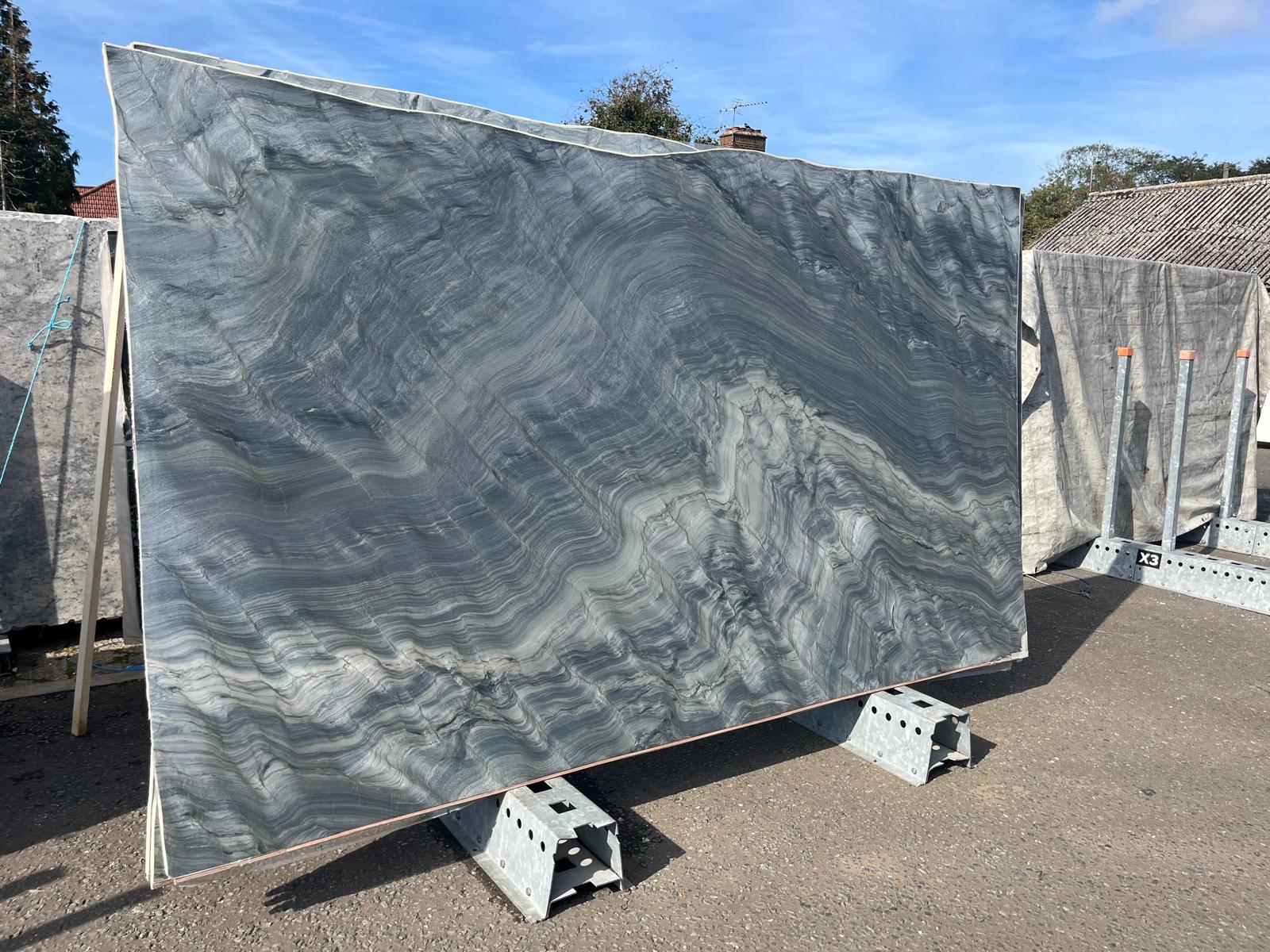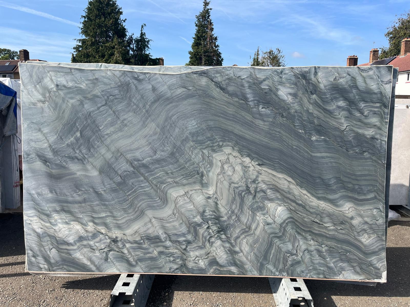 Deep blues in the wave pattern on this natural quartzite. Statement Piece.