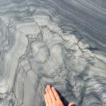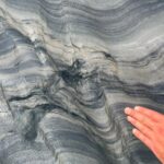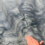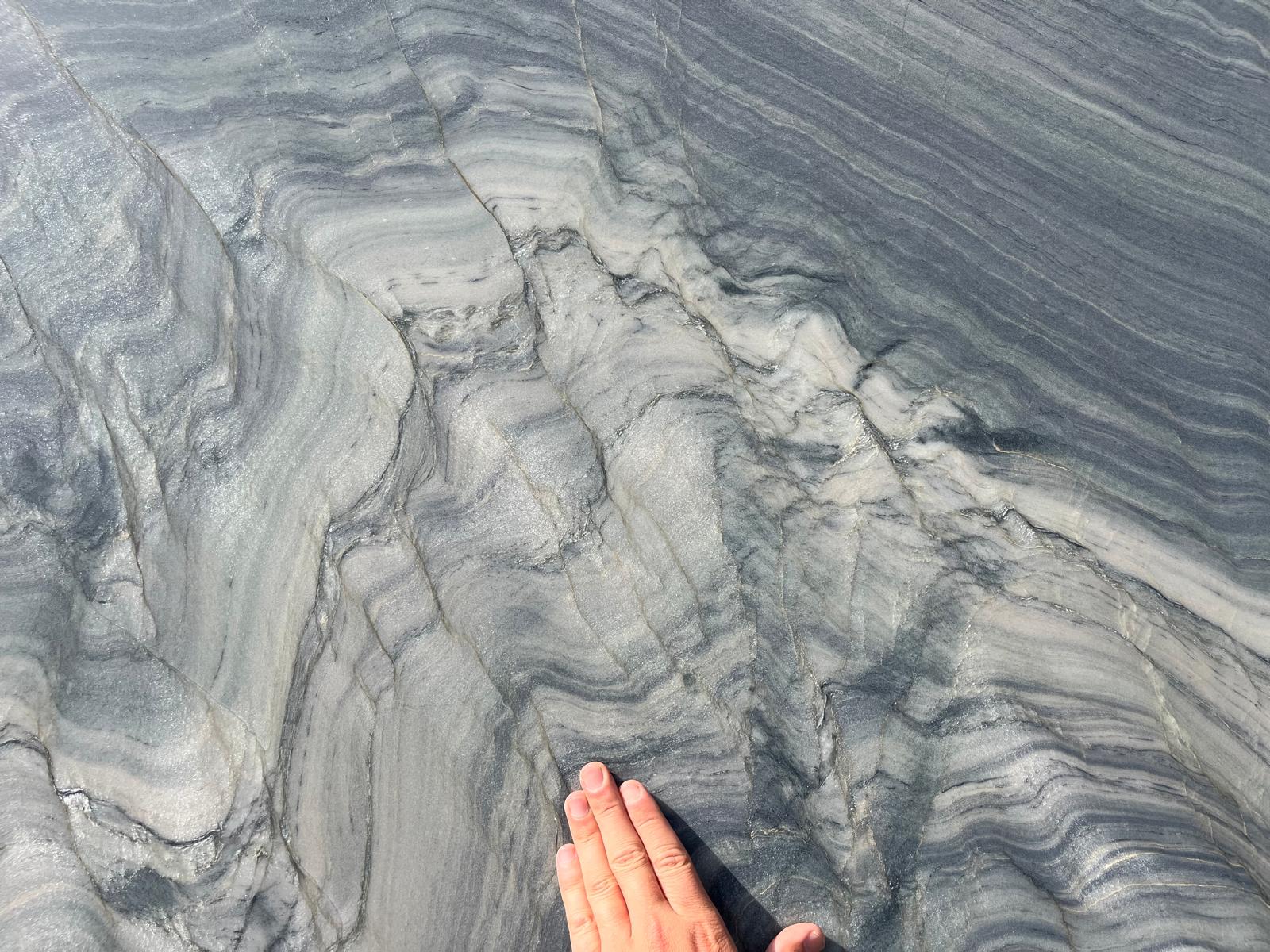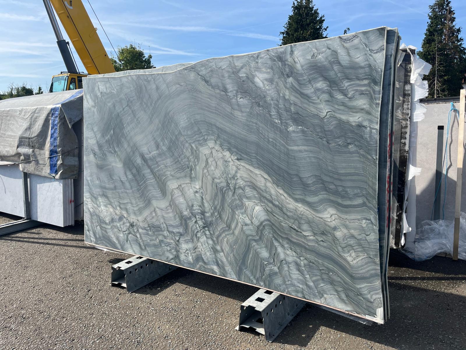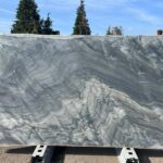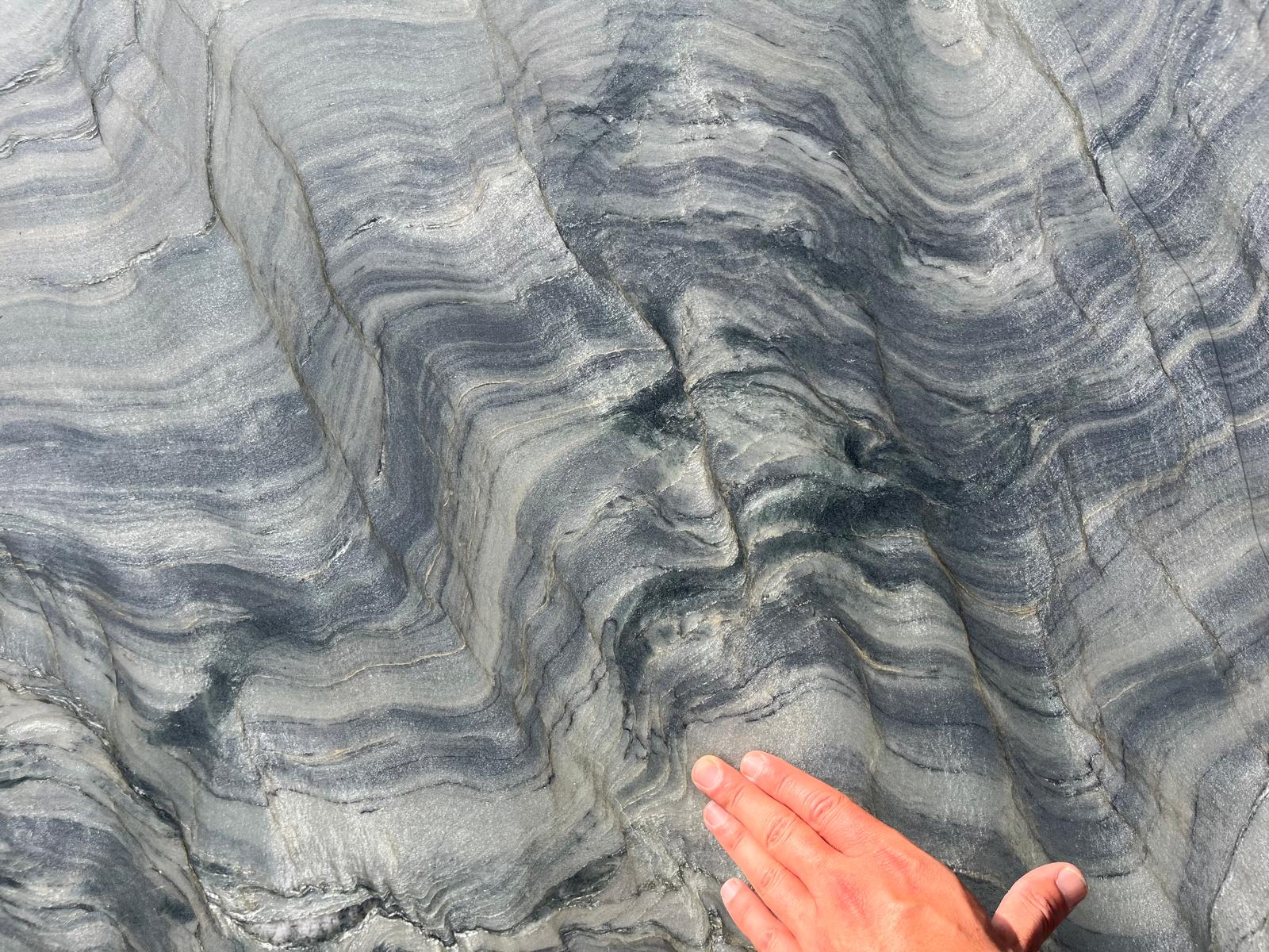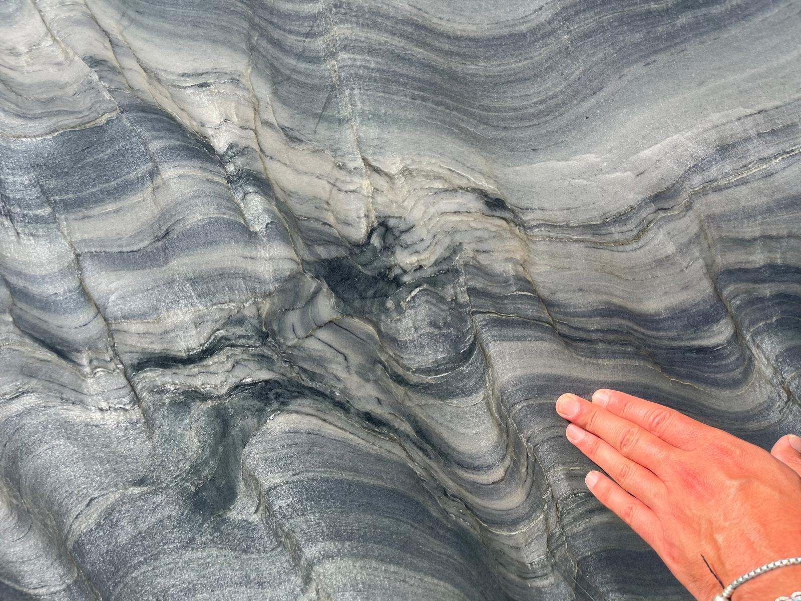 Deep blues in the wave pattern on this natural quartzite. Statement Piece.
