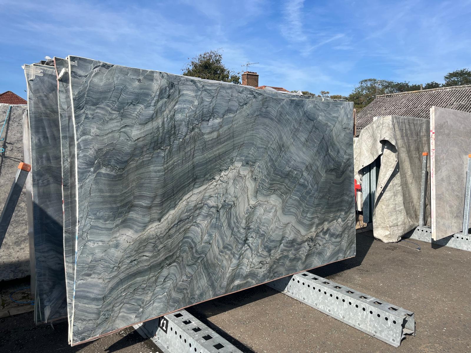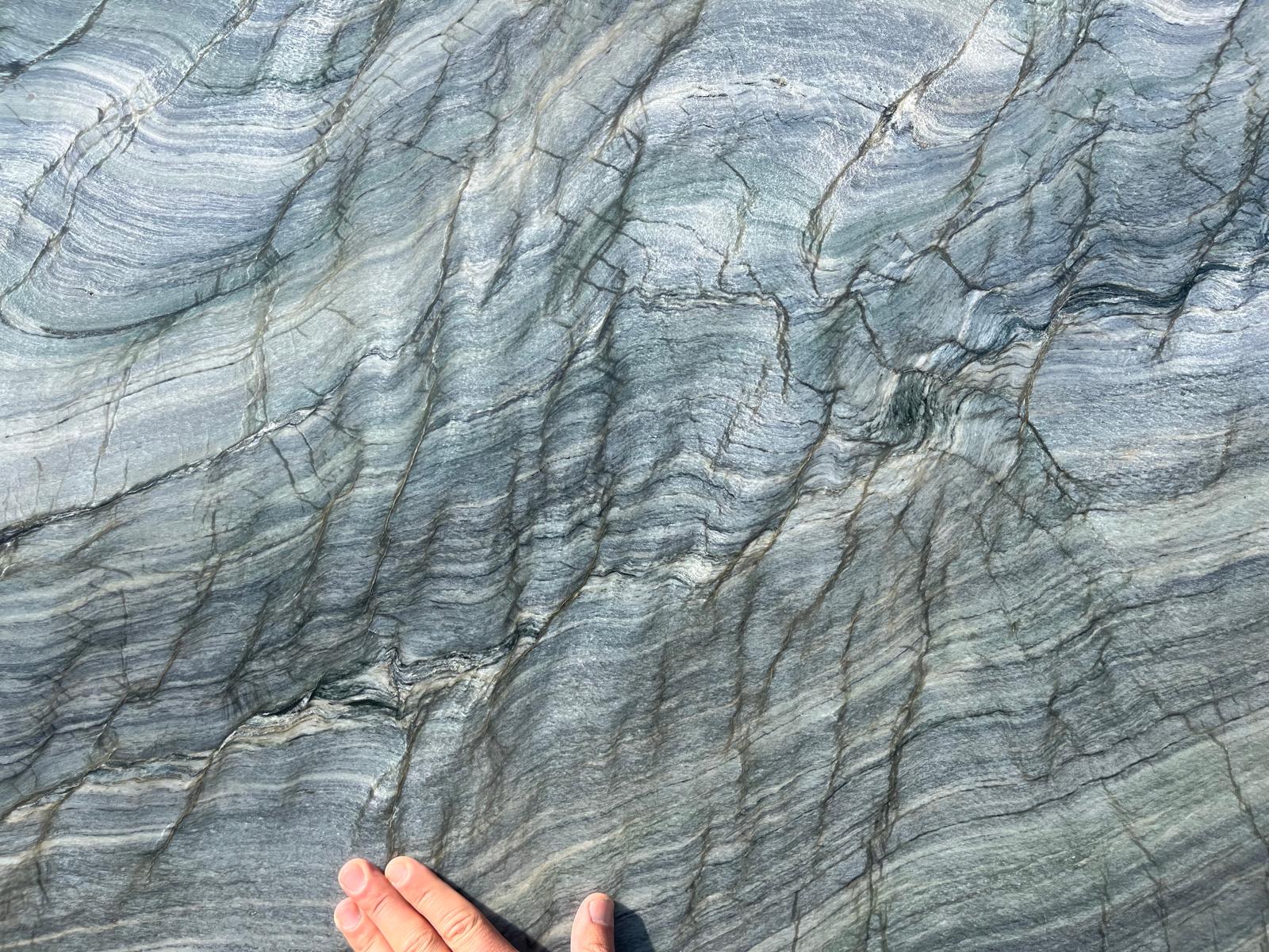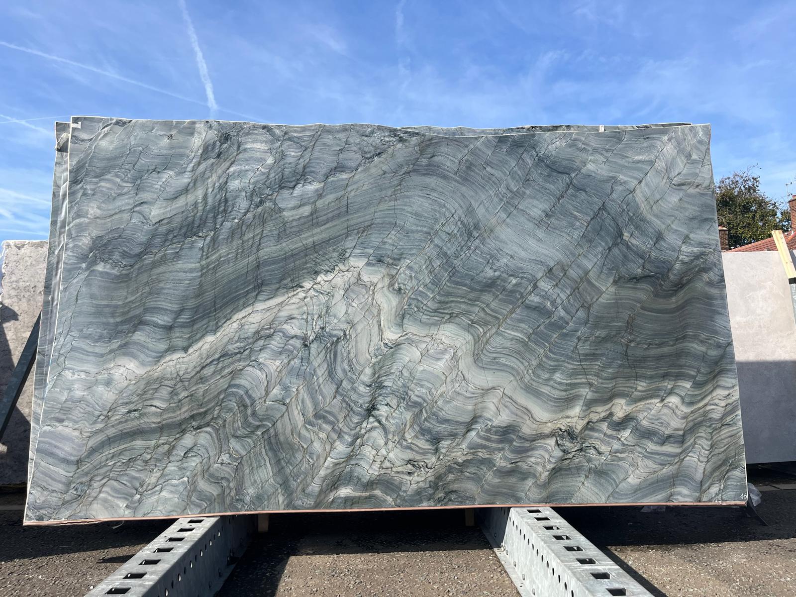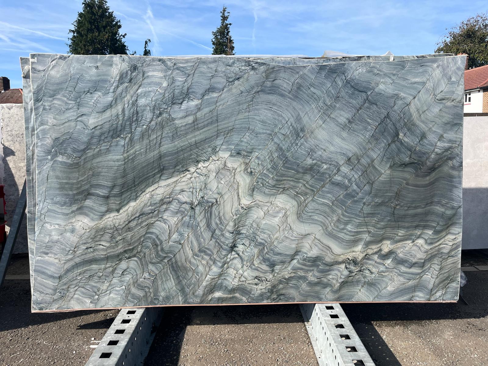 Deep blues in the wave pattern on this natural quartzite. Statement Piece.