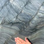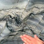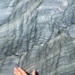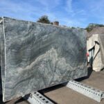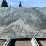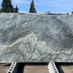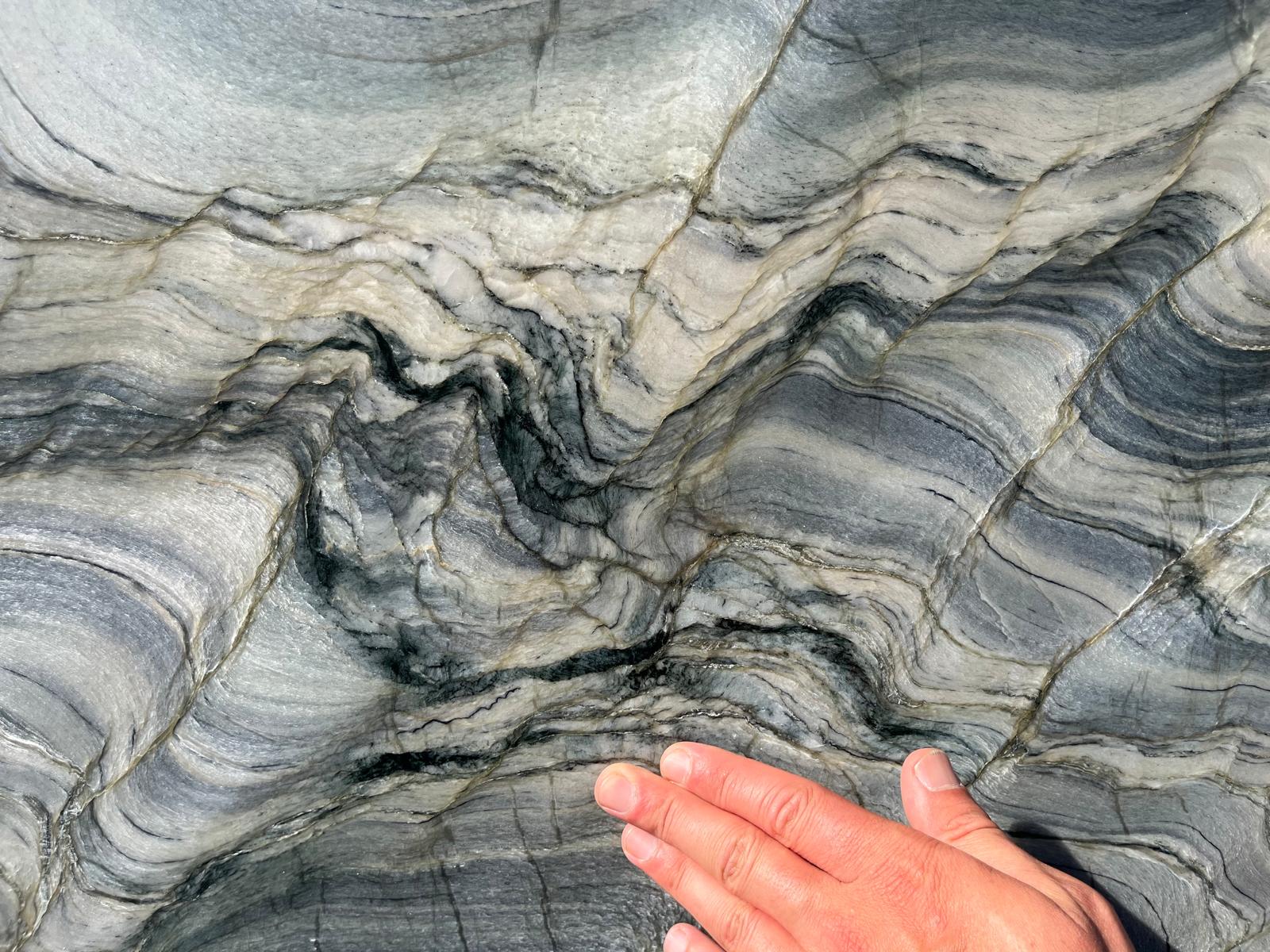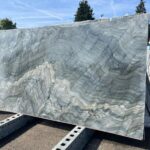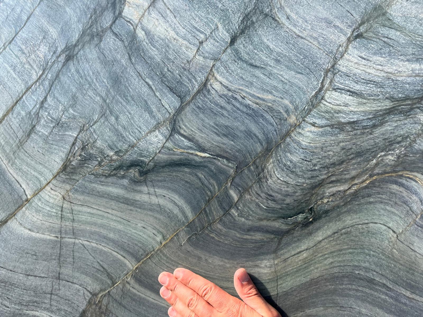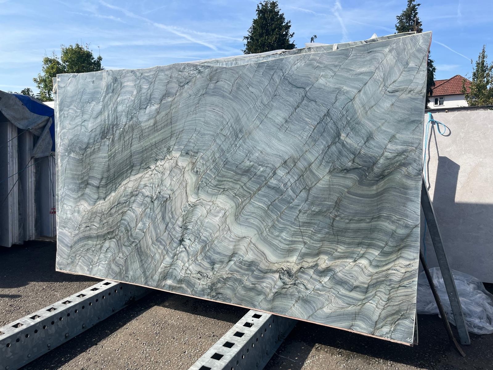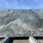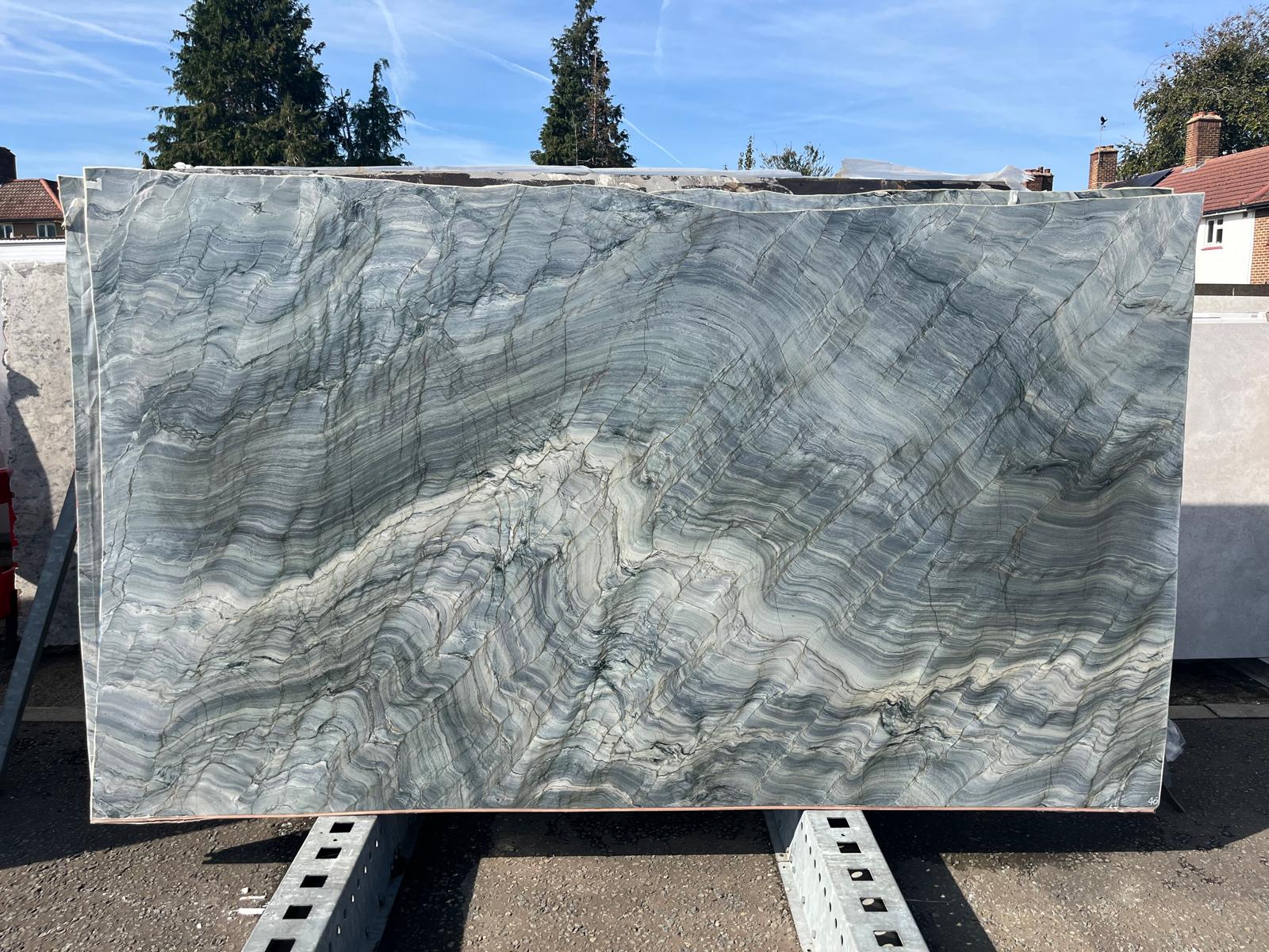 Deep blues in the wave pattern on this natural quartzite. Statement Piece.