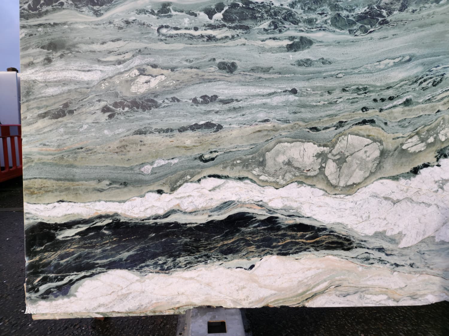 The palette blends soft jade green, pale mint, light grey, white veining, and deeper green ribbons, often arranged in sweeping, river‑like formations. Some blocks present gentle, clouded transitions, while others show more defined linear bands with dramatic contrast. This natural variation gives Jade River Marble a dynamic yet calming presence suited to both contemporary and traditional interiors.
