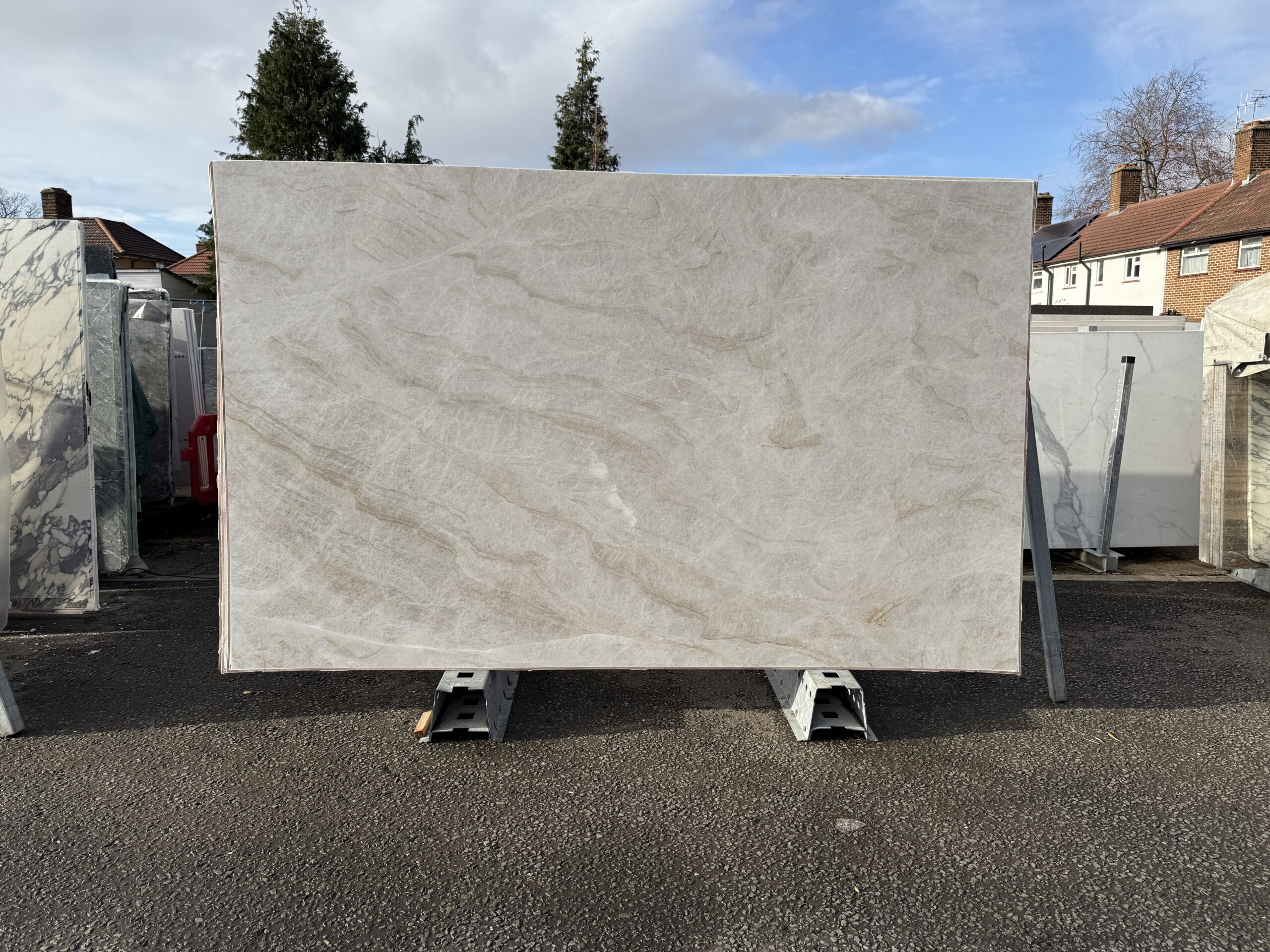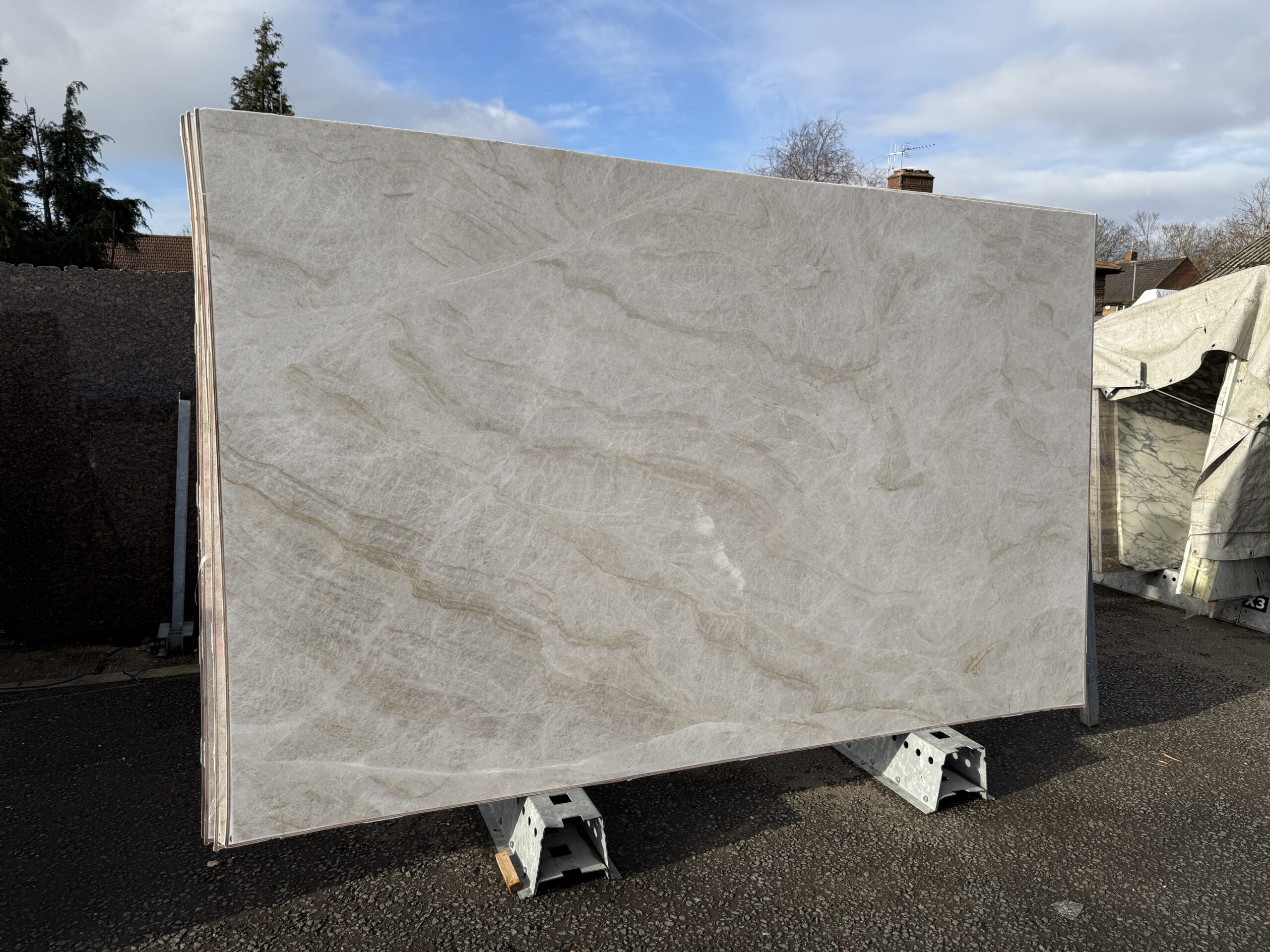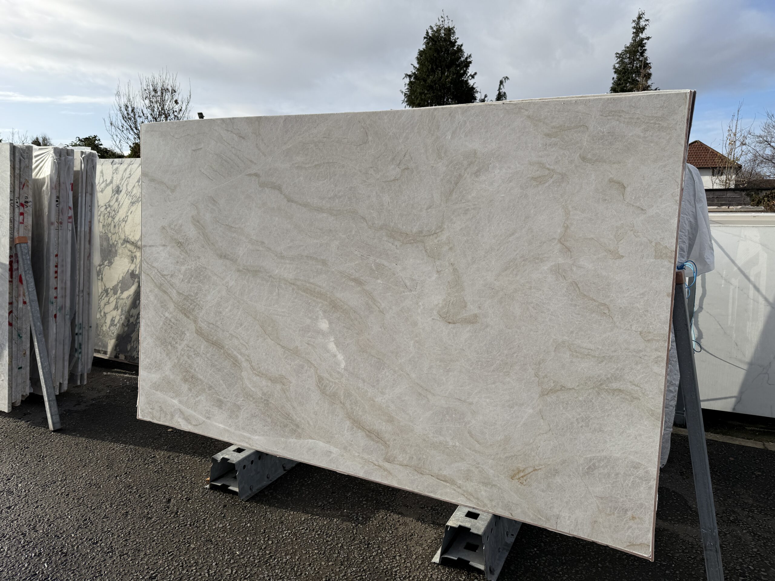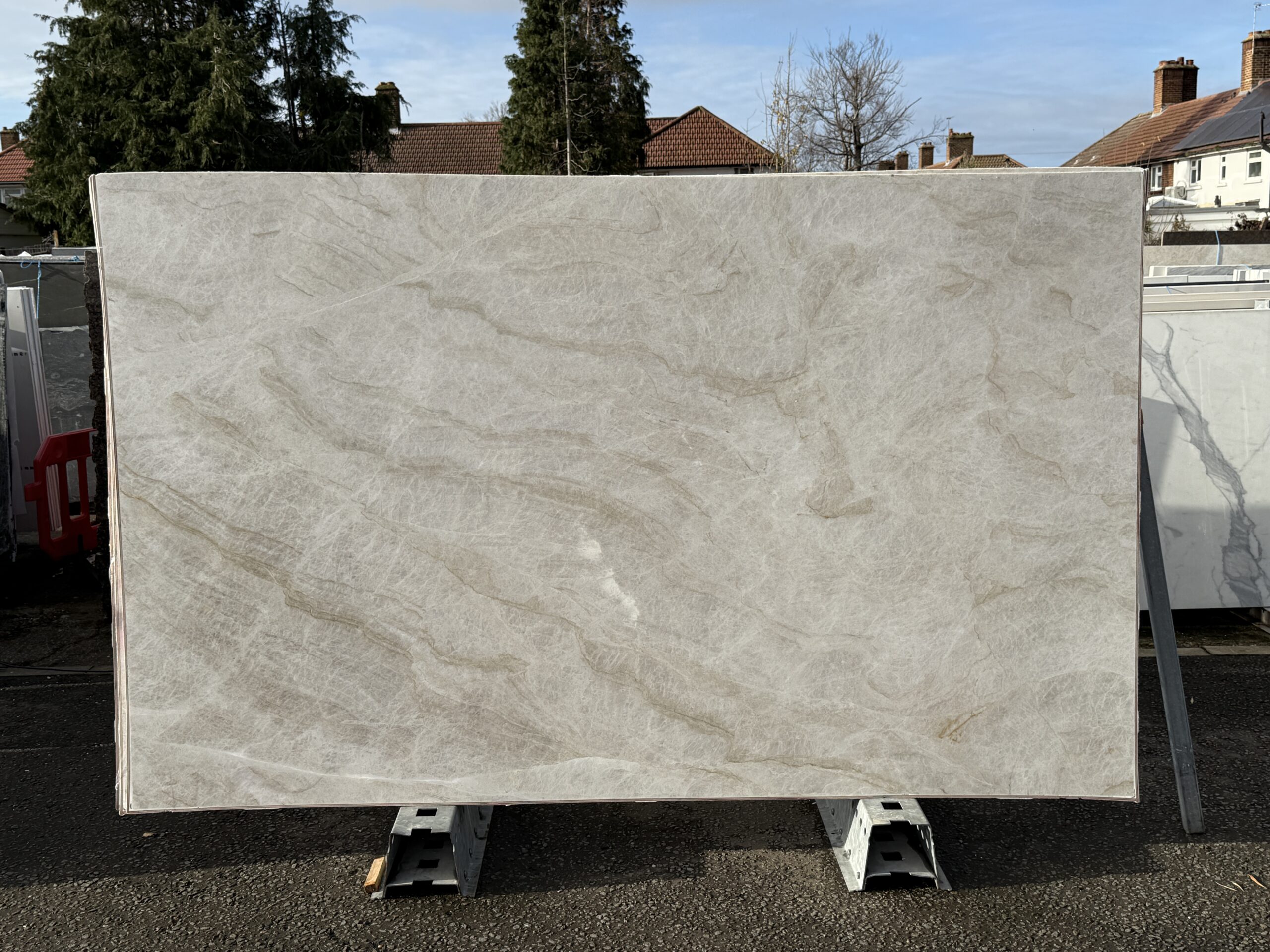 Cream and beige with white fracturous veining. An elegant very hard Quartzite.